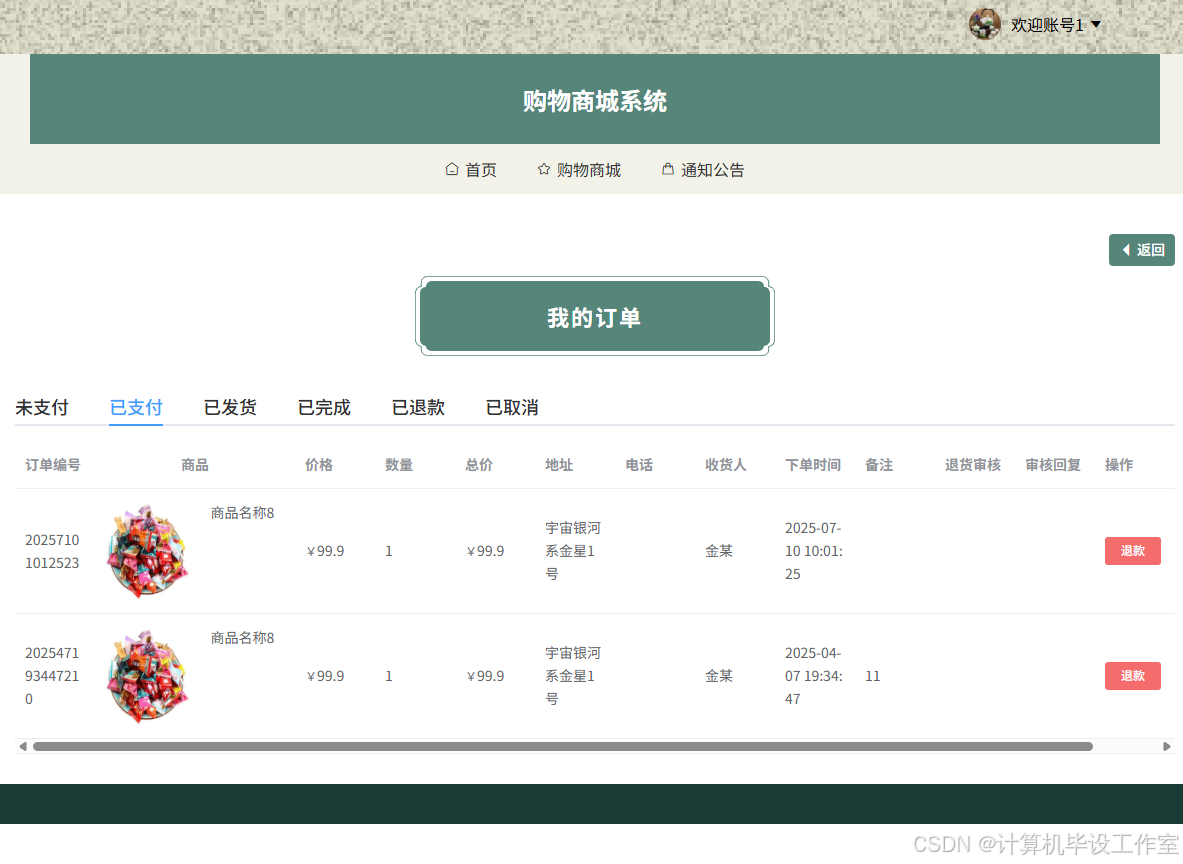 管理员点击“订单管理”模块中,可以对所有用户提交的订单进行处理操作,比如查看已经支付订单,审核退货订单等。