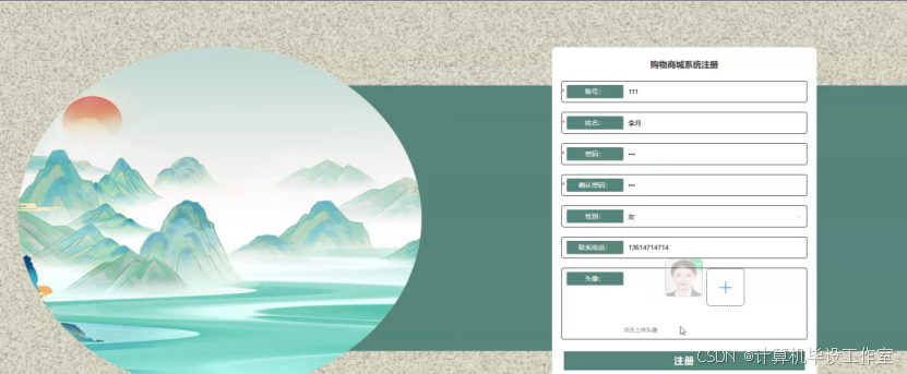 用户可以在购物商城系统界面中点击注册按钮,对应输入用户账户、密码、确认密码、用户姓名、性别、手机号码、头像等进行提交,注册后资料由系统验证,验证成功后,表明创建账户成功,用户才可以凭账户和密码进行登录使用该系统。