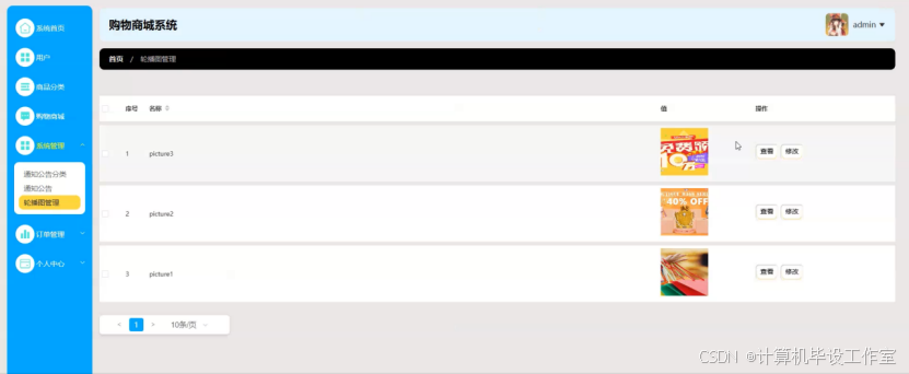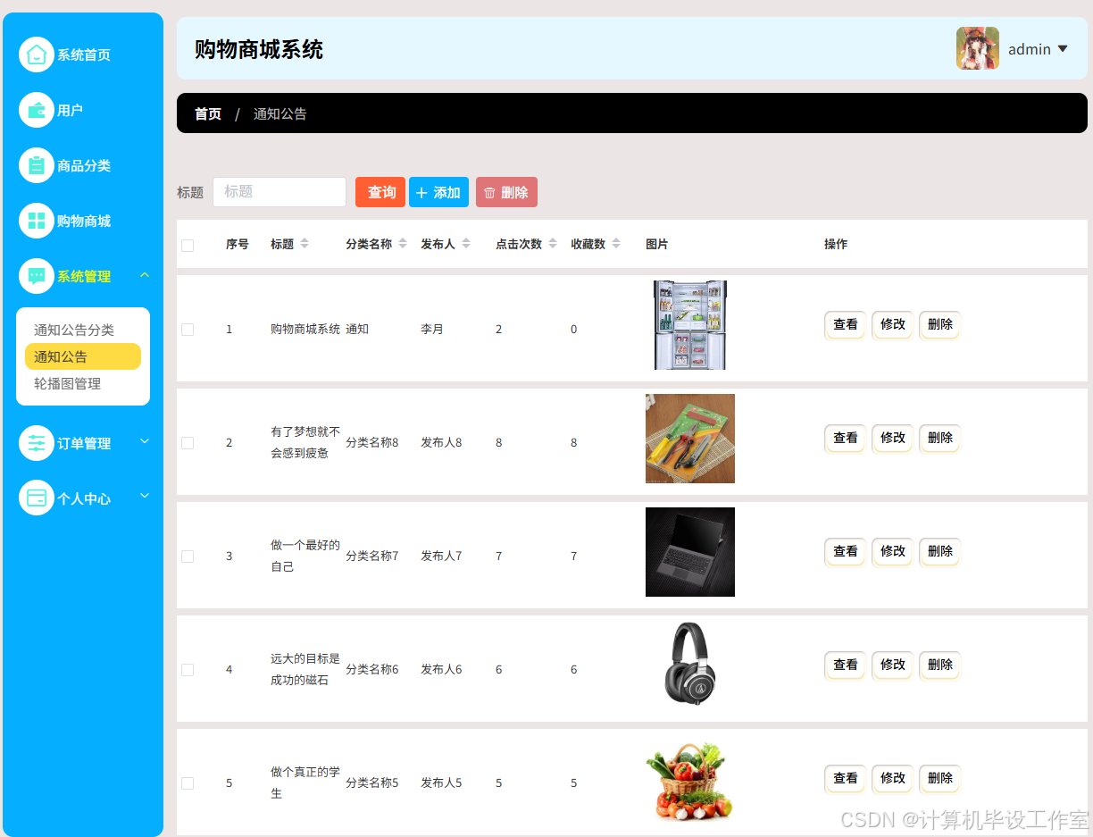 管理员能够通过后台中的系统管理进行通知公告的发布、公告分类、轮播图设置管理操作等。