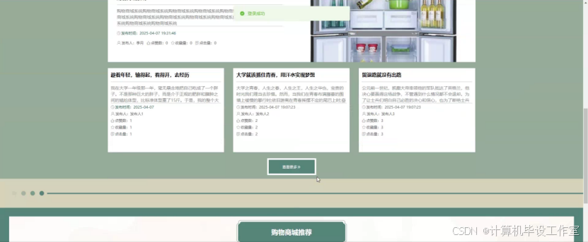 登录成功后,用户进入首页模块,首页主要展示轮播图以及各大功能板块,功能导航栏在系统界面直上方,用户可见购物商城、通知公告、个人中心等模块,也可以点击搜索框查找对应内容。