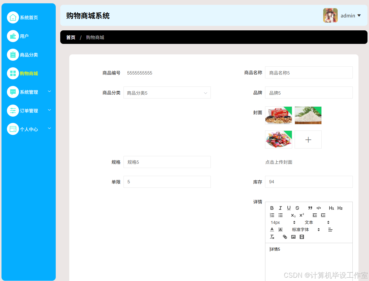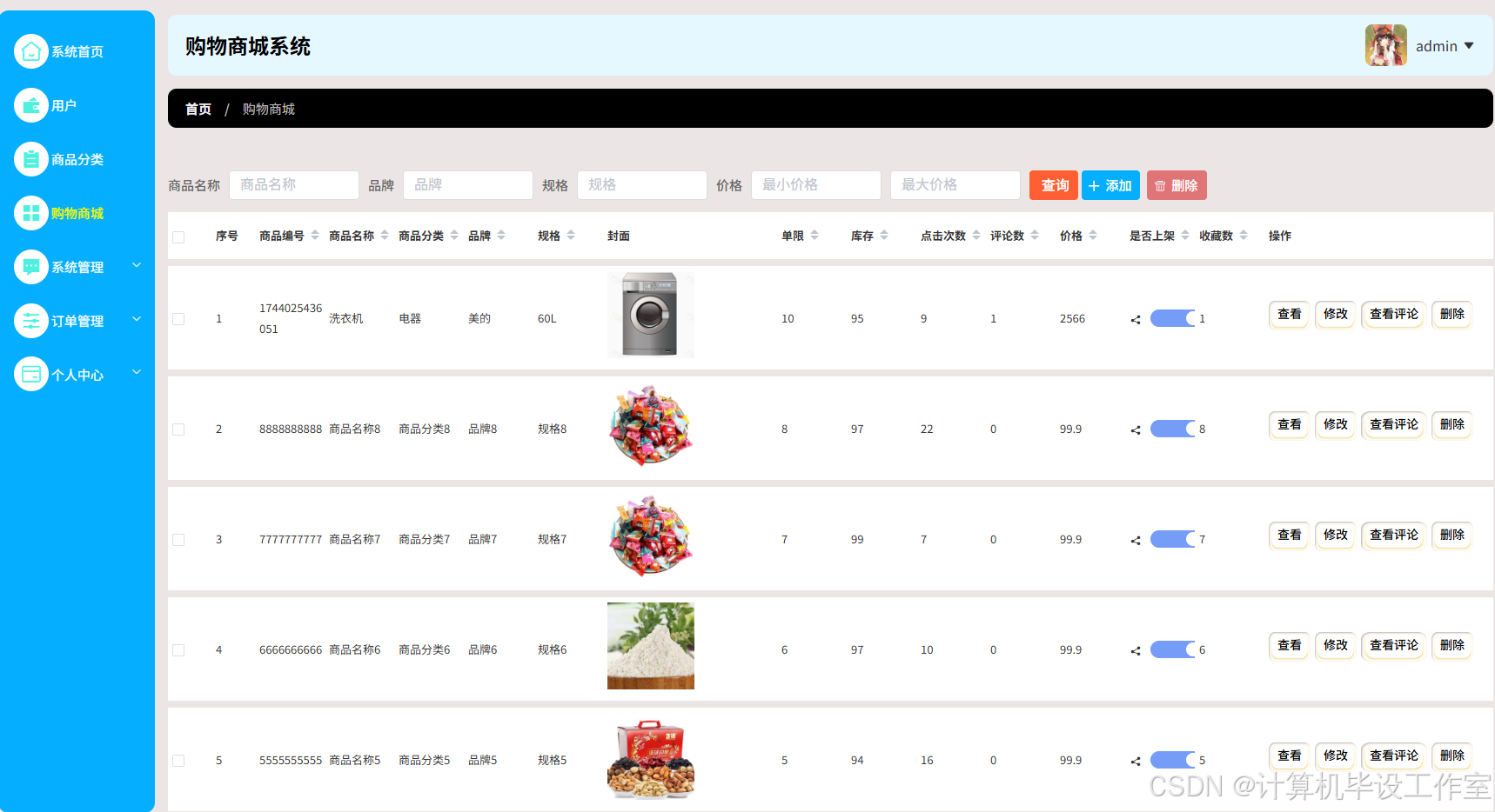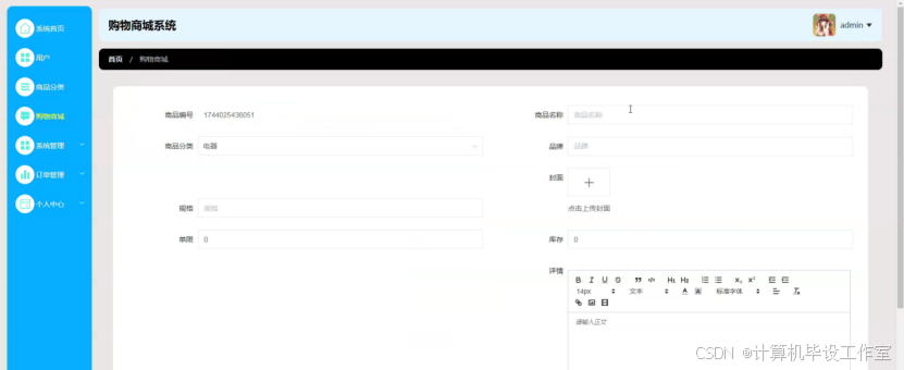 管理员通过点击购物商城界面,可以对所有商城中的商品信息进行上架发布,包括商品编号、商品名称、商品分类、图片、品牌、规格、库存、价格等,管理员主要维护和管理商城内容。
