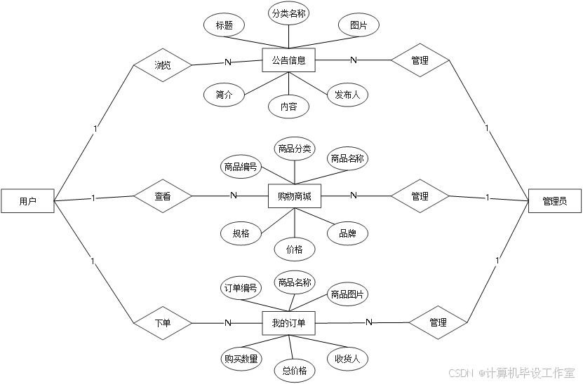 概念设计是数据库设计的第一步,其主要目标是对系统的数据需求进行全面的理解和抽象。在这一阶段,通过建立实体-关系模型(ER模型)来识别系统中的关键实体、属性及其相互关系。概念设计的输出是一个清晰的ER图,作为后续数据库表设计的基础。以下将展示系统的全局E-R图。