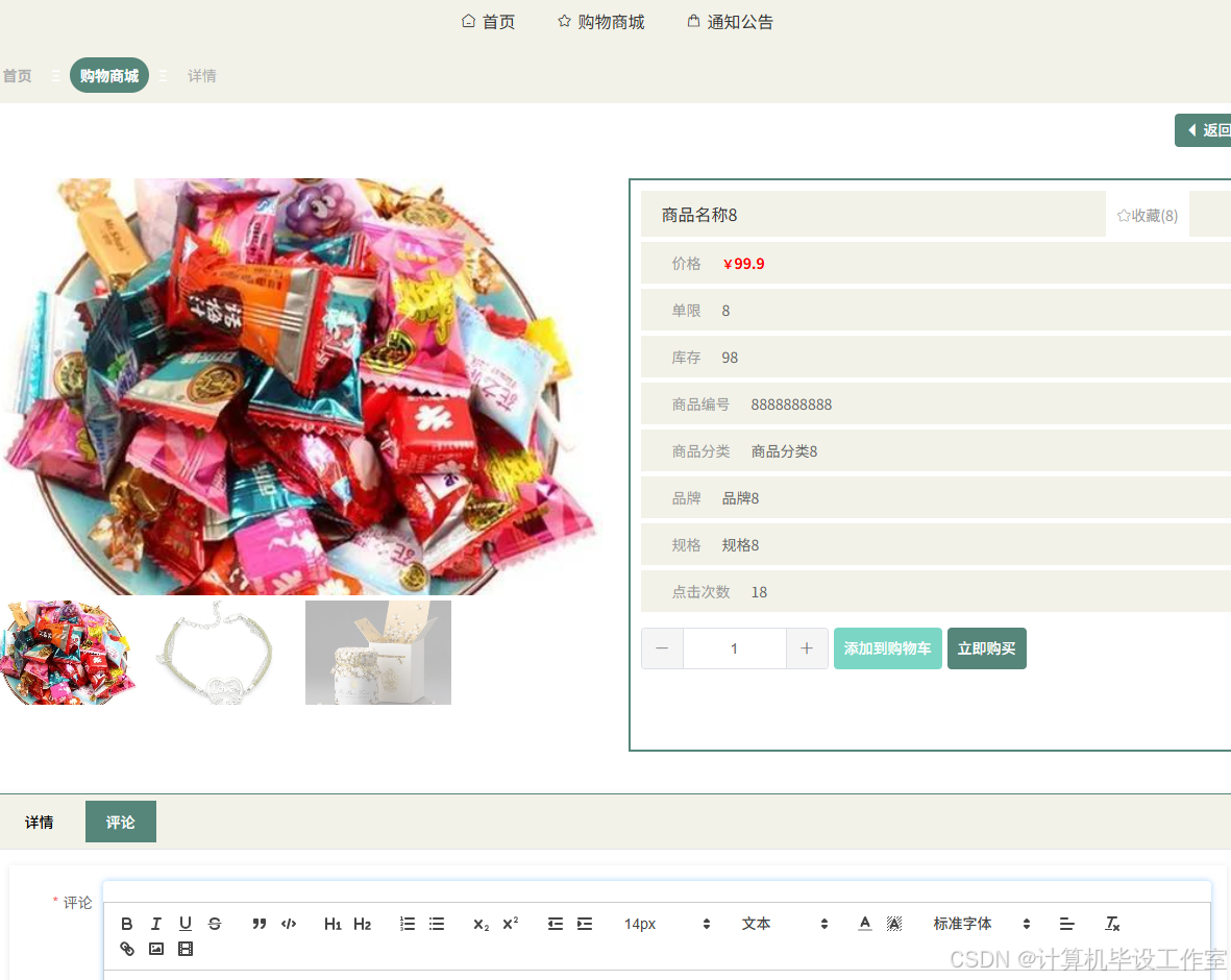 (4)购物商城:用户点击购物商城中查看产品展示,用户主要可以对上架的所有商品进行查看和选购,可以了解每款商品的名称、价格、库存、介绍等,可以对某款商品进行点评和收藏。