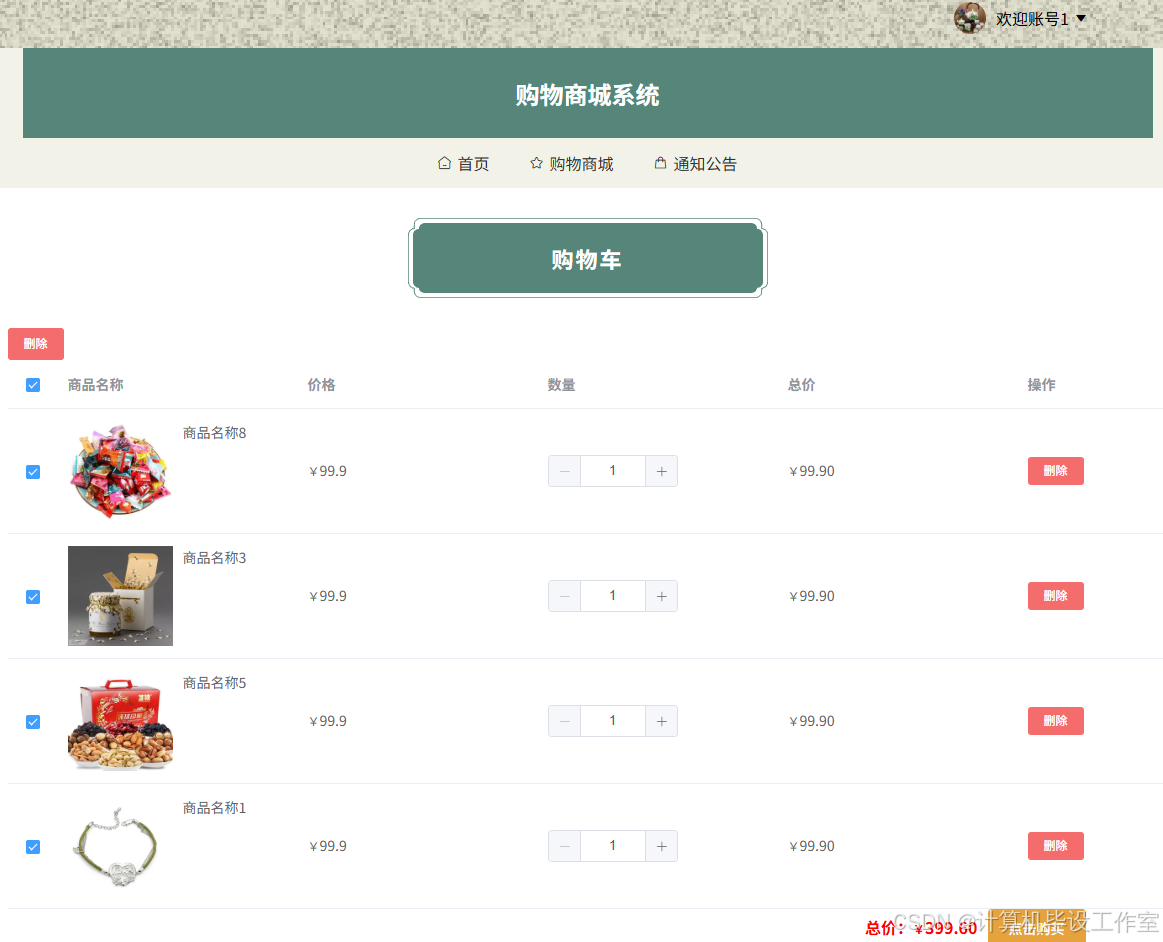 (5)购物车:用户可以对选中的商品进行添加购物车操作,购物车可以随意添加数量等。