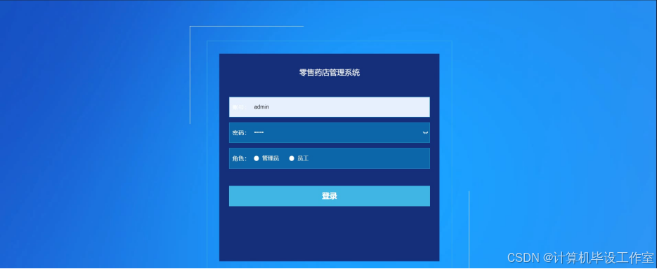 员工的账户统一由管理员进行添加,添加后方可输入自己的账户和密码以及选择角色(即身份)点击登录,系统将会验证改员工的信息资源是否无误,无误即可登录成功,有无提醒账户或者密码输入错误提示。登录功能效果图如图5-1所示。