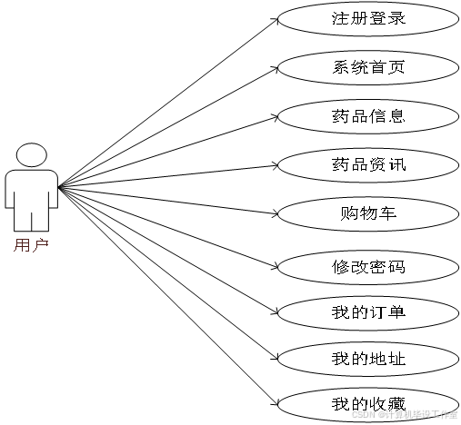 用户先点击进行注册,完成新账户的创建方可使用该系统;在系统首页中可以浏览各种功能模块;在药品信息模块中具体查看药品详情,包括药品名称、药品分类、剂型、数量、具体详情等,可以选择药品后添加购物车操作;点击药品资讯可以浏览系统发布的最新资讯动态;在个人中心中可以修改密码、查看我的订单;编辑我的收货地址。用户功能用例图如图3-1所示。