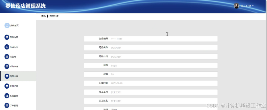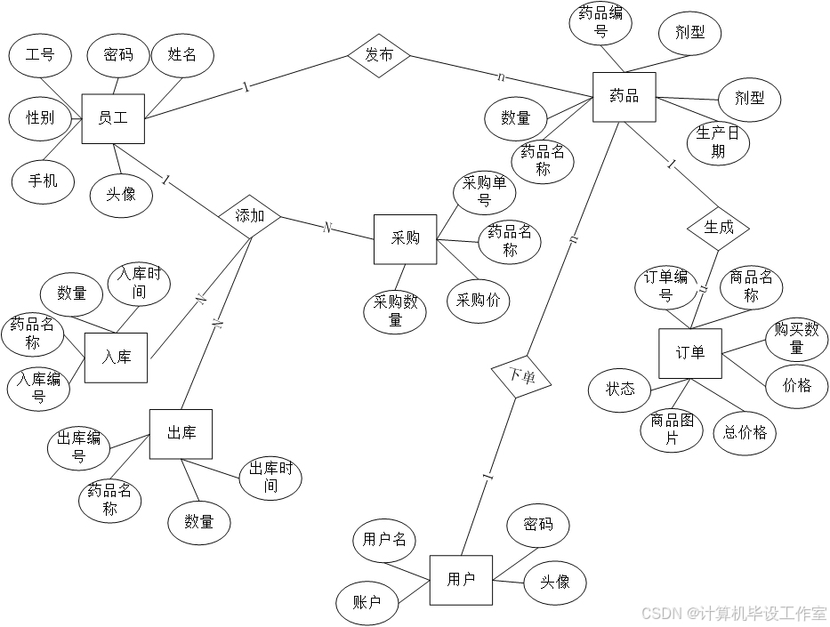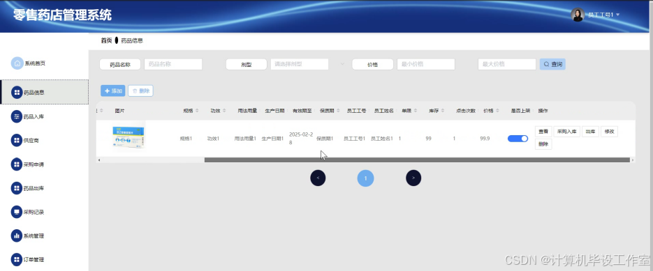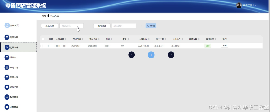 (2)员工功能:药品信息管理、药品入库、供应商管理、采购申请、药品出库、订单管理以及发货等功能