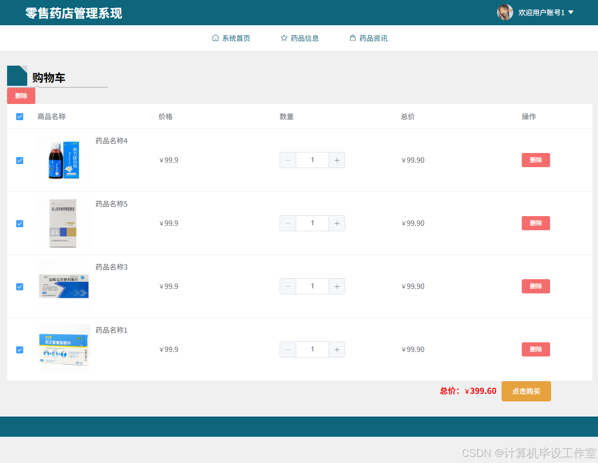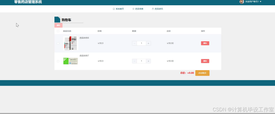 用户可以在药品信息界面点击“添加购物车”,将药品下单购买操作。购物车功能效果图如图5-9所示。