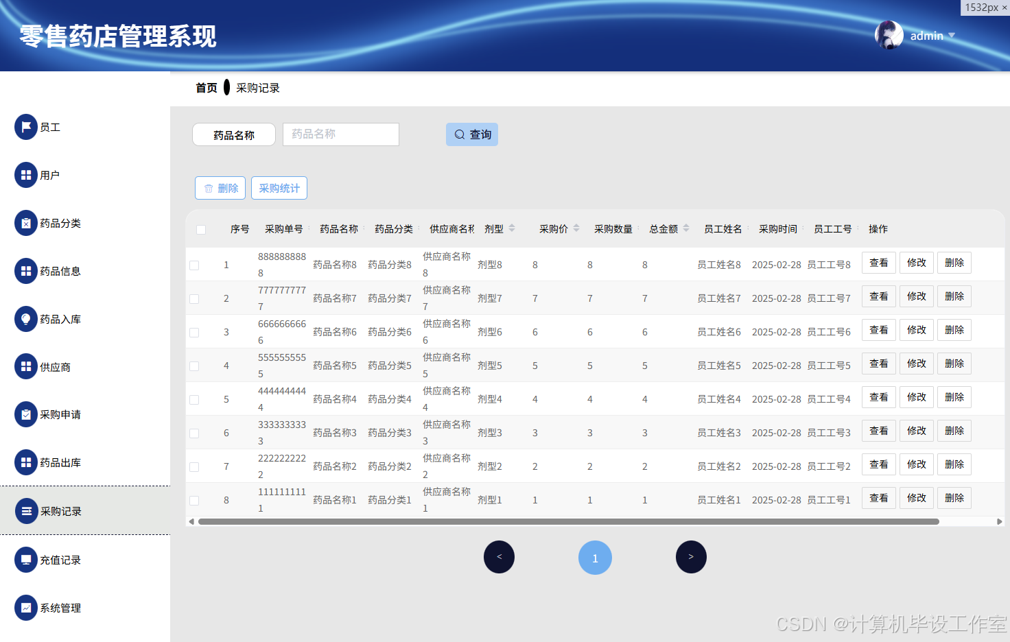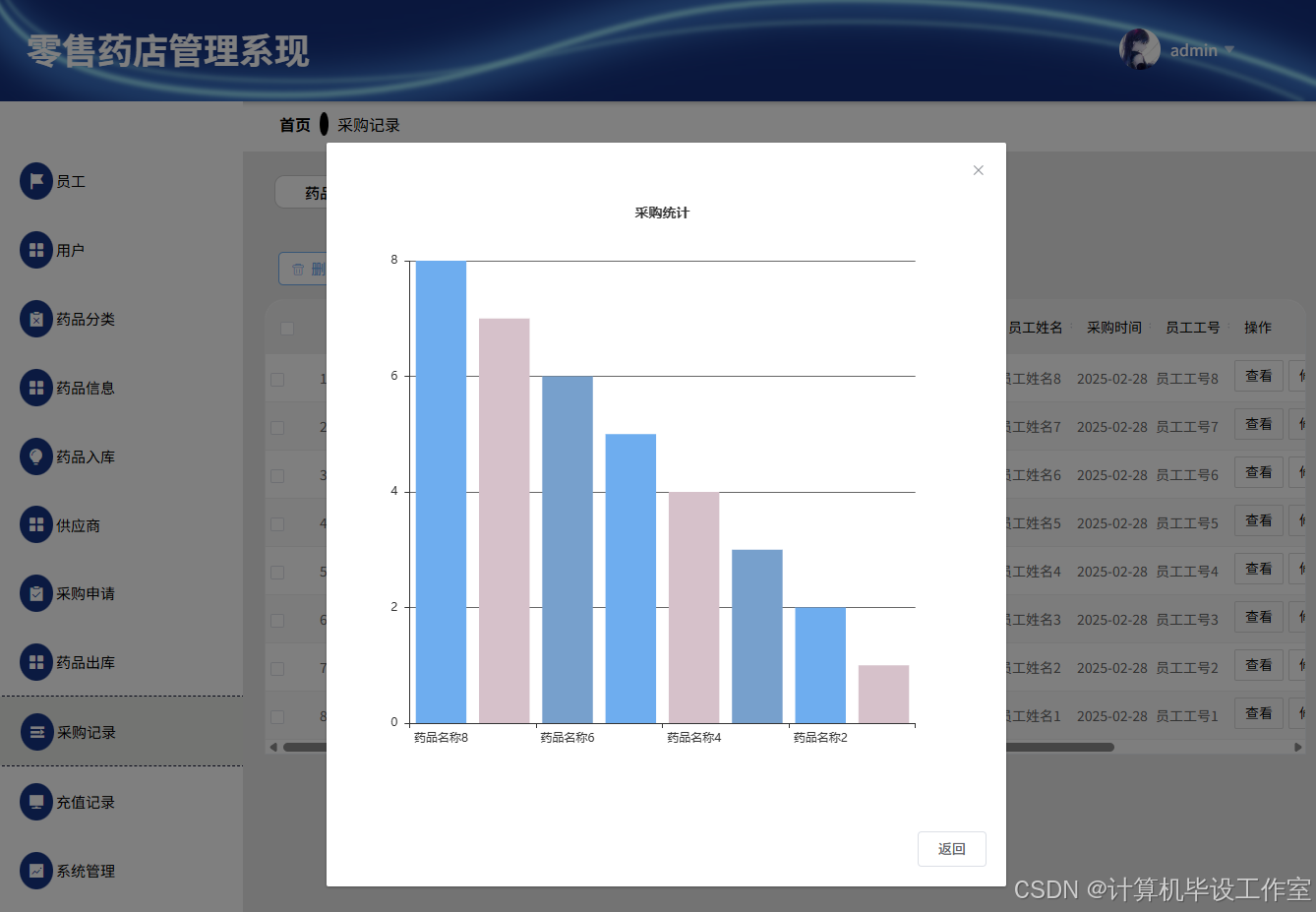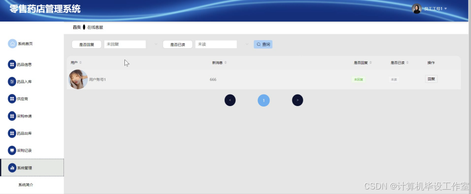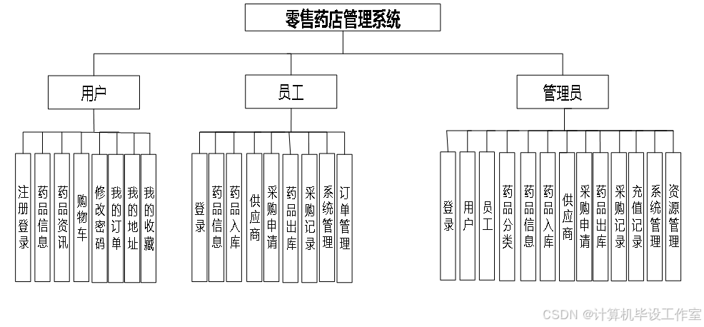 (3)管理员功能:员工管理、用户管理、客服回复、药品信息管理、药品入库管理、供应商管理、采购申请管理、药品出库管理、药品资讯管理、订单管理、图表统计分析