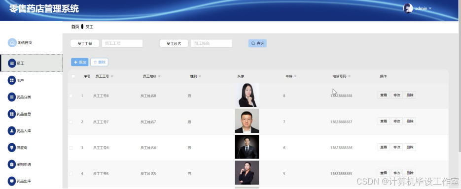 管理员进入系统后,点击“员工”模块,系统展示所有员工的基本信息。管理员可通过搜索框查找特定员工,可以对员工账户信息进行添加、修改、删除操作。员工功能效果图如图5-10所示。