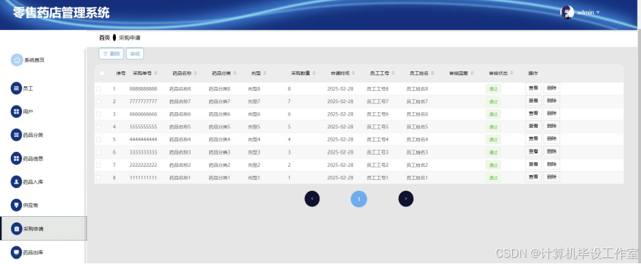 管理员点击“采购申请”模块,可以对所有的药品采购信息进行查看和统计操作,统计具体的药品采购数量以及进行审核。采购申请功能效果图如图5-12所示。