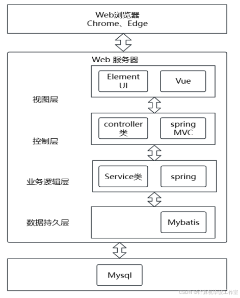 本项目采用B/S架构,遵循MVC设计思想,采用前后端分离的方式进行架构搭建。系统主要由表示层、控制层、业务逻辑层和数据层构成,系统架构如图4-1所示。