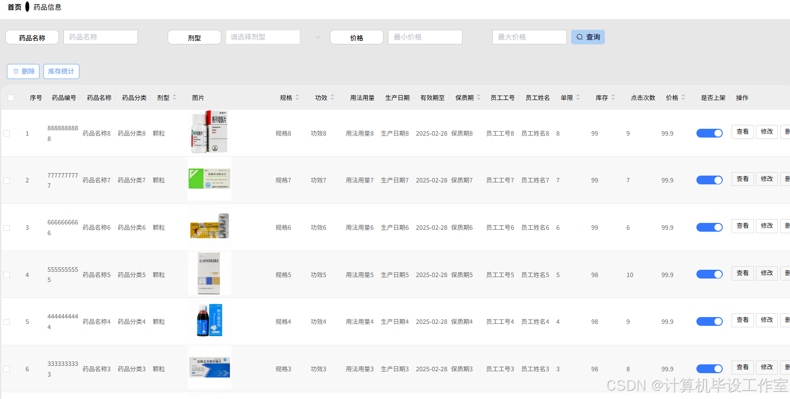 在“药品信息”模块中,员工可以进行药品的添加、修改、删除操作,药品列表可见具体的药品编号、名称、生产日期、有限期、保质期、价格、负责的员工信息等。药品信息功能效果图如图5-2所示。