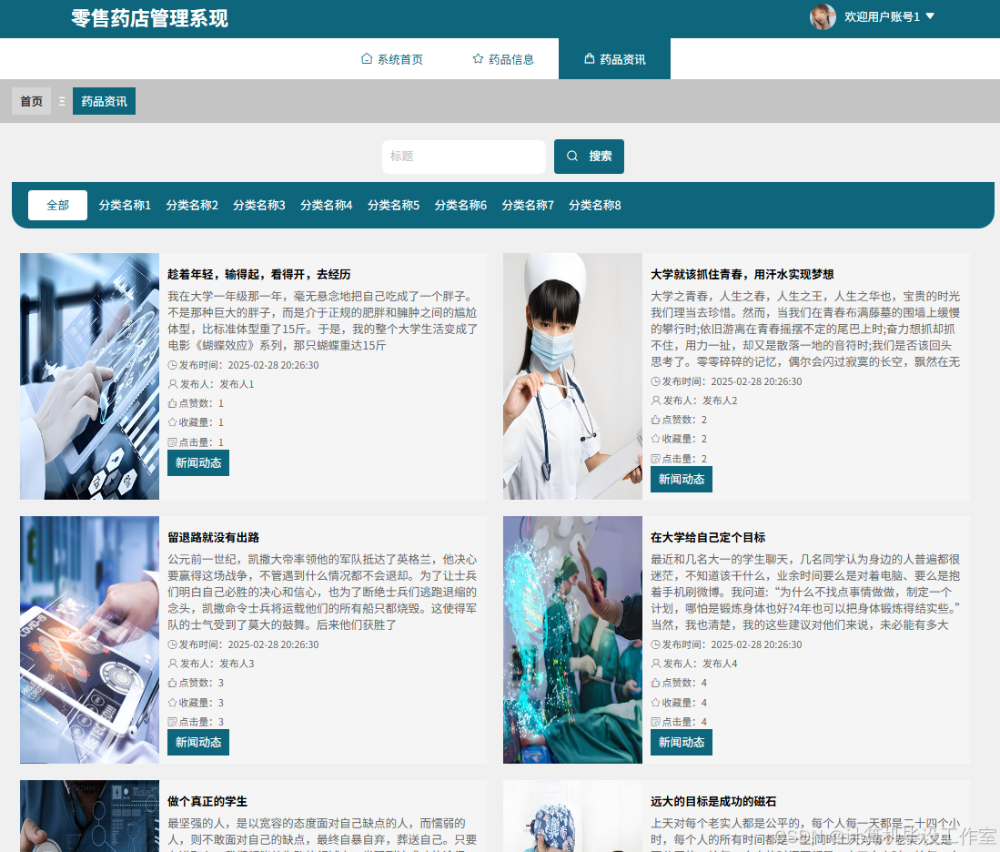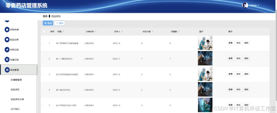 管理员点击“药品资讯”模块,可以对所有系统的最新资讯内容进行发布和管理。药品资讯功能效果图如图5-13所示。