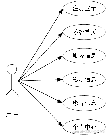 用户可注册登录平台,登录后进入系统首页,查看影院信息、影厅布局与设施等。影片信息页面展示影片简介、上映时间、导演演员等详情。个人中心功能丰富,用户能管理个人信息,包括修改密码、查看充值记录,还能查看我的订单、我的收藏以及我的优惠券,方便用户随时掌握观影相关动态,享受个性化观影体验。用户的用例图如图2所示。