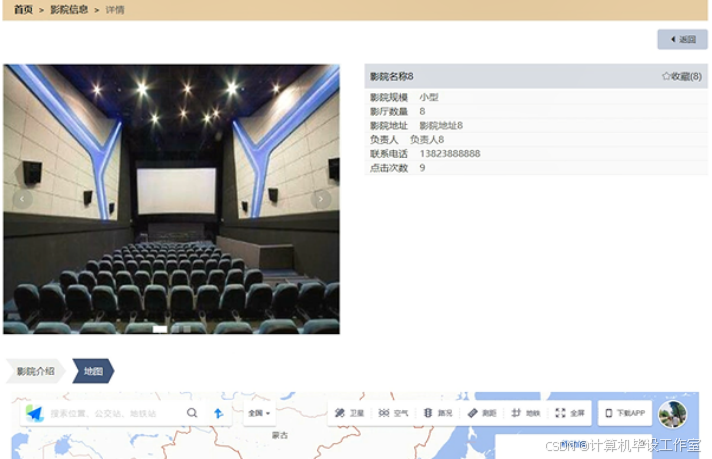 在影院信息页面中,用户可以看到影院规模、影厅数量、影院地址、负责人、联系电话等基本信息,在下方的地图中,用户可以根据导航找到影院,如图23所示。