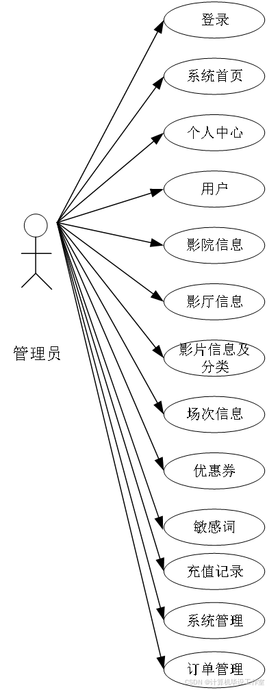管理员登录后进入系统首页,可快速了解平台整体运营情况。个人中心用于管理自身账号信息。在用户管理模块,管理员可查看用户列表、处理用户反馈等。影院信息管理支持添加、修改影院信息;影厅信息管理可配置影厅座位、设备等。影片分类模块方便管理员对影片进行分类管理,场次信息管理用于安排影片放映场次。影片信息管理可上传、更新影片资料。优惠券管理用于发放、回收优惠券,敏感词管理保障平台内容安全。充值记录管理可查看用户充值明细,系统管理涉及权限分配、日志查看等,订单管理用于处理订单状态、退款等事务,助力管理员高效掌控影院运营全貌,提升管理效率与服务质量。管理员的用例图如图3所示。