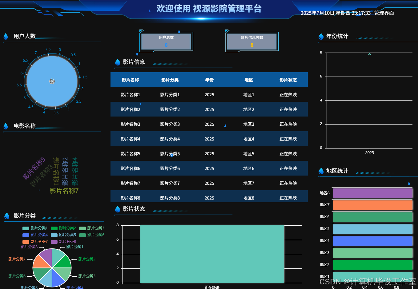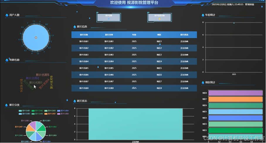 通过扇形图、柱状图、直线图、表格等形式,管理员可以清晰直观地看到用户人数、电影名称、影片分类、影片信息、年份统计、地区统计等信息,如图13所示。