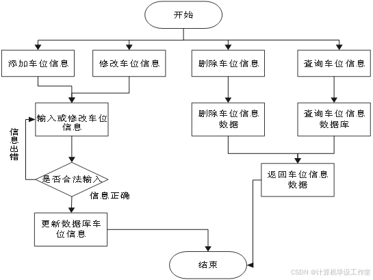 在基于人脸识别的酒店管理系统中,管理员可以对车位信息进行增删改查,如管理员输入的车位信息是否有误,如是否合法输入车位信息等,待后台检测数据,系统会将管理员输入的数据写入数据库,当管理员删除和查找车位信息数据时,后台会根据输入的信息删除和显示对应车位信息的数据,具体流程图如图3-4。