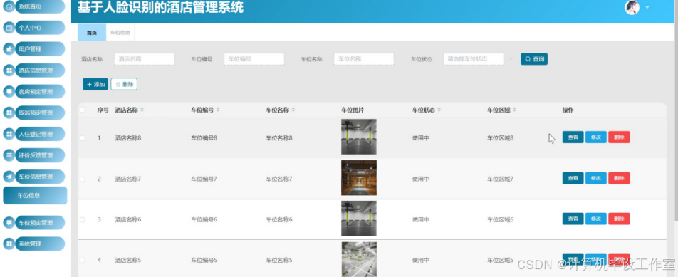 管理员进入车位信息管理页面,可以对酒店的所有车位进行添加、修改、删除操作,更新的车位状态将会展现在客户界面。