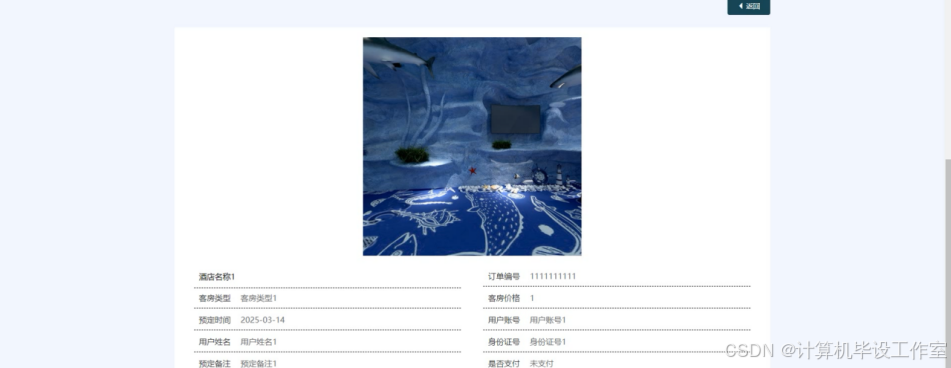 客房预定:用户可以在酒店信息界面选中某个客房点击“预定”提交具体的预订信息,包括预订时间、所选房间信息、用户身份证信息等提交。