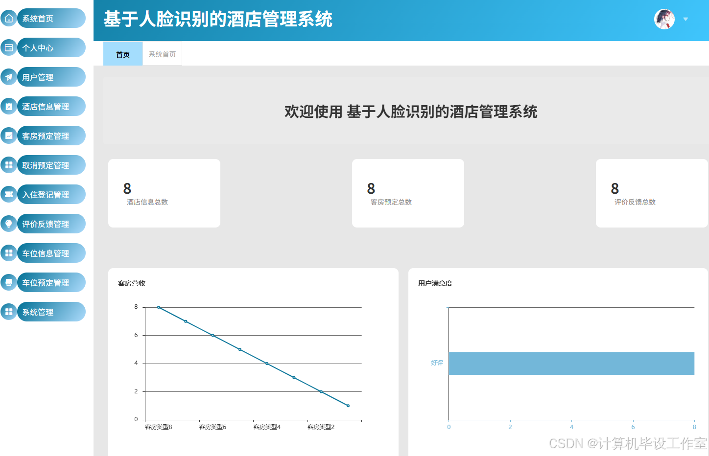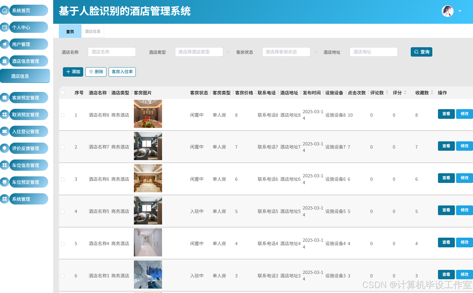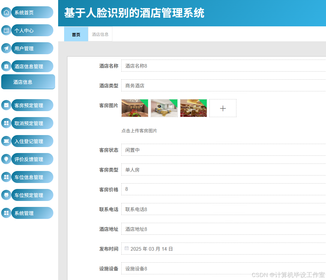 随着信息技术和人工智能技术的快速发展,人脸识别技术在各个领域的应用日益广泛。酒店行业作为服务行业的重要组成部分,始终致力于提升客户体验和服务效率。传统酒店管理方式往往依赖人工处理入住登记、客房预定及取消等事务,这不仅耗时费力,还存在信息记录错误或遗失的风险。同时,顾客对于住宿体验的要求也在不断提高,期望能够获得更加便捷、安全且个性化的服务。