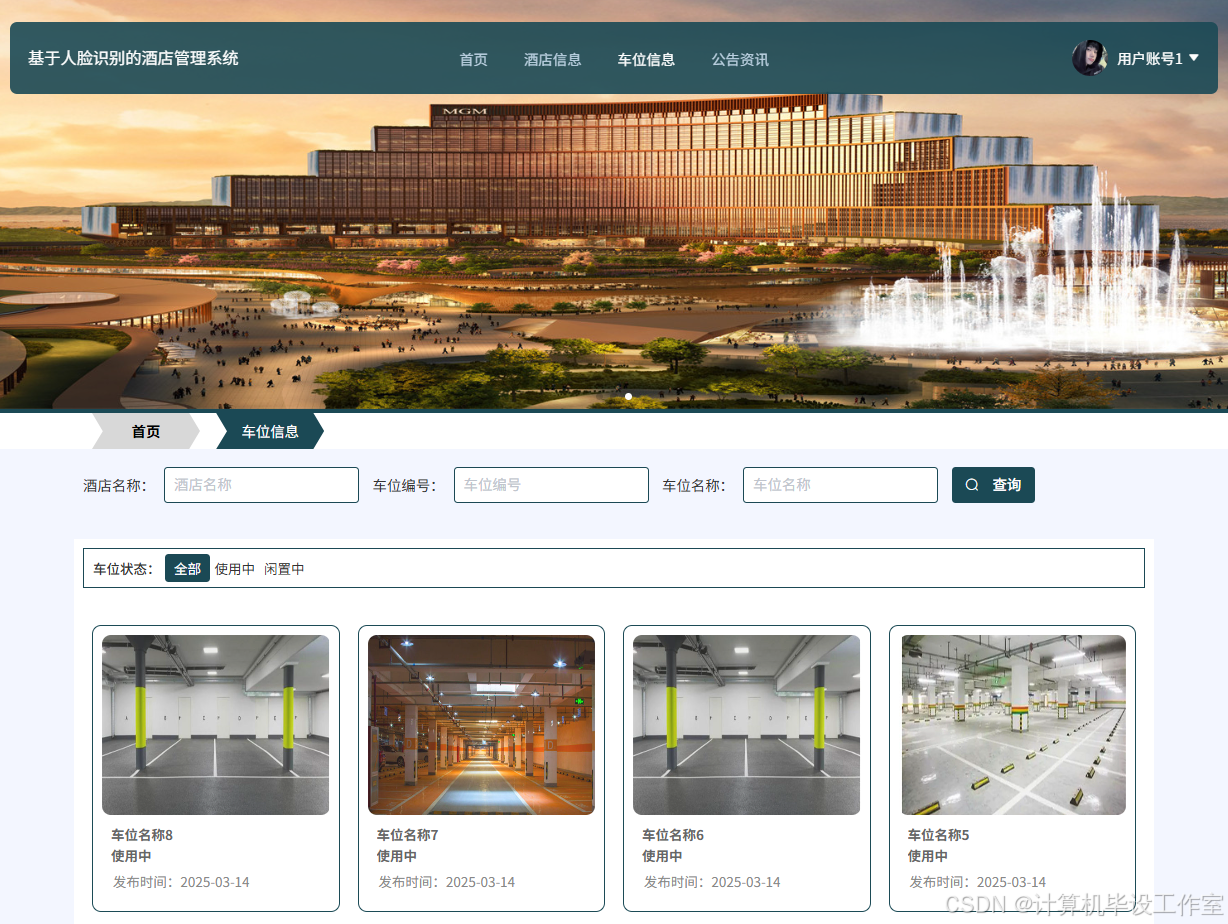 用户点击系统中的车位信息界面,可以查看酒店的车位详情,点击预定界面,可进行在线车位预定操作。