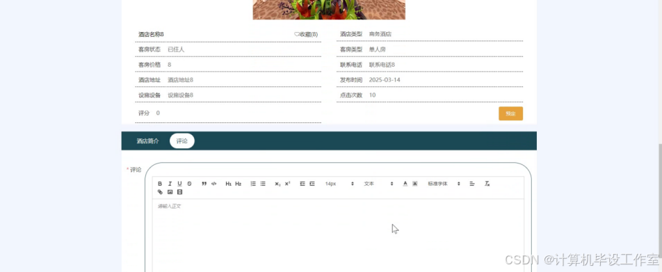 酒店信息:用户点击酒店信息列表,可以查看酒店名称、酒店类型、客房状态、客房类型、客房价格、联系电话、酒店地址、设施设备等,用户可以对酒店信息进行点赞、收藏、评论操作。