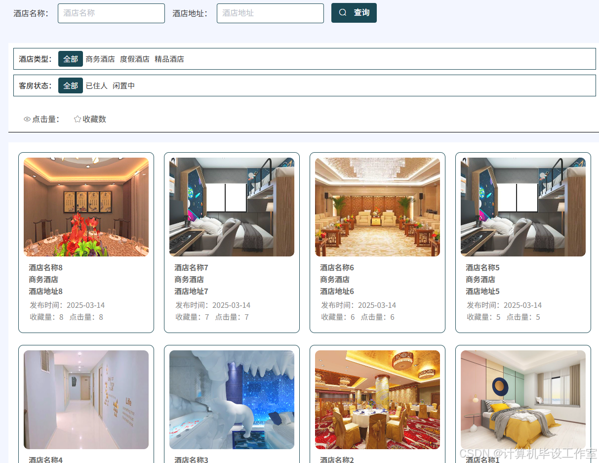 酒店信息管理:管理员可以对酒店的房间信息进行发布,包括酒店名称、客房图片、客房类型、客房价格、房间设施等内容。