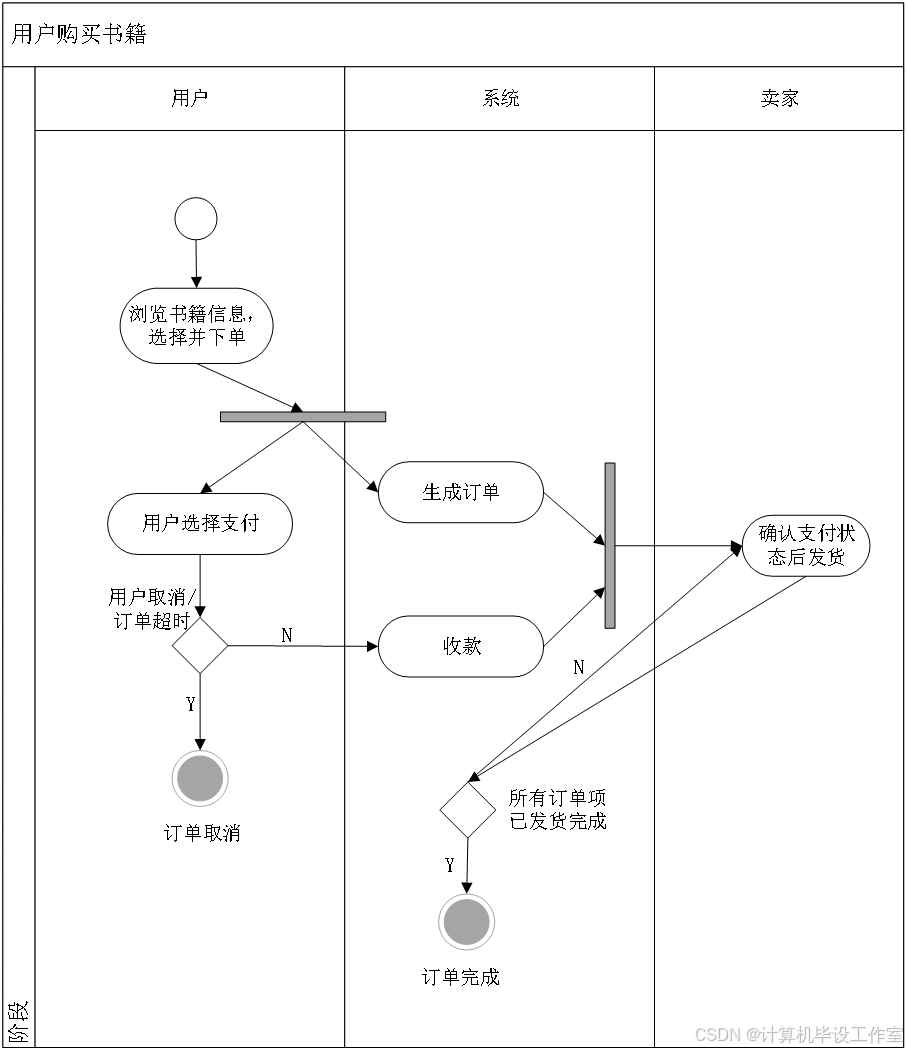业务流程图既反映了内部业务间的相互联系,又反映了书籍信息交易和信息流动情况。校园二手书回收系统须支撑整个机构不同层面的多种职能,而各功能模块间存在着多种关联信息,组成一个有机整体,并针对书籍信息自身特点和面临的现实条件,对系统进行业务流程图设计。系统通过流程的顺畅和高效,实现了书籍信息交易需求的满足和系统管理的便捷,提升了系统的运行效率和用户体验。校园二手书回收系统的业务流程如下图所示。