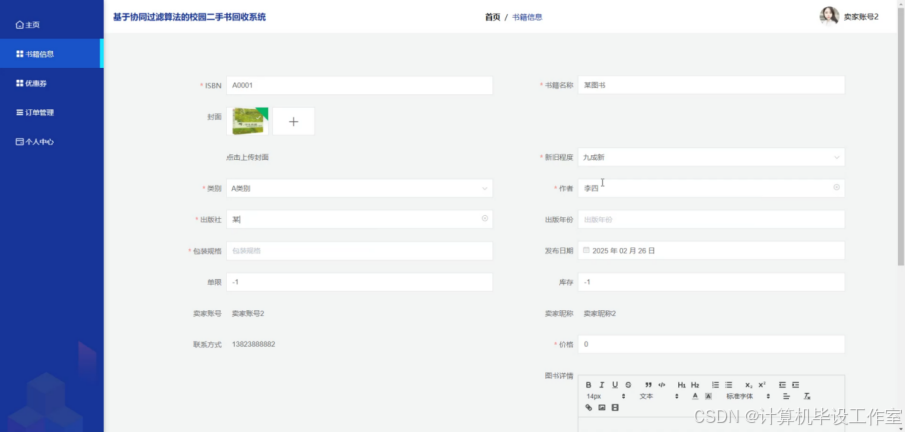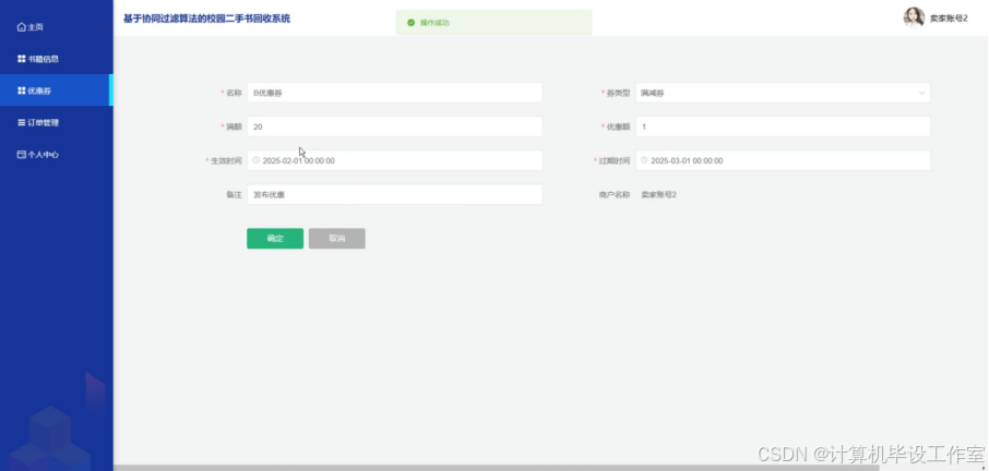② 卖家:可以在系统后台查看、发布和管理书籍信息、优惠券,还有订单管理和个人中心等功能。