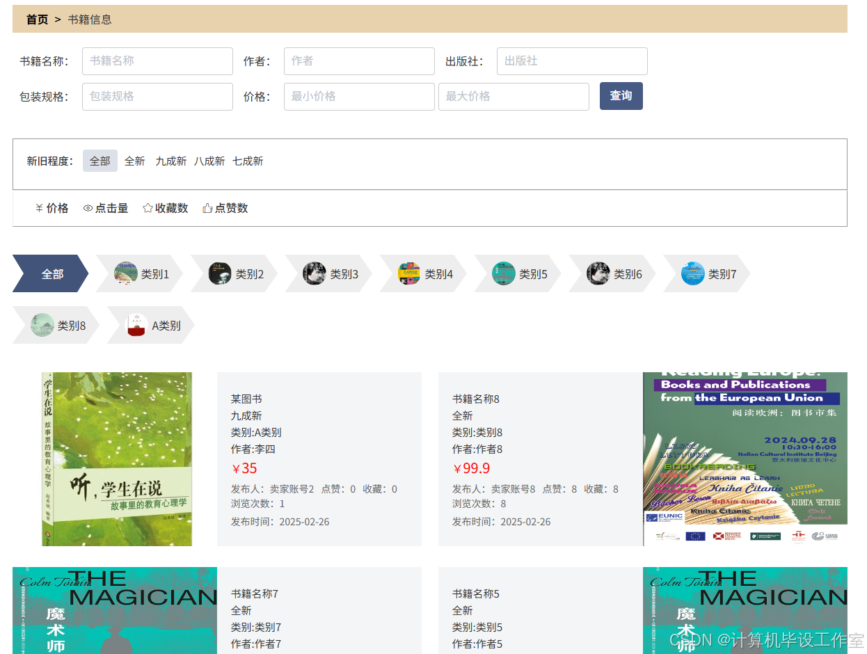 - 书籍信息管理:卖家及管理员可以对书籍信息的发布、修改、删除等操作,支持进行类别的查看、添加、修改和删除操作。