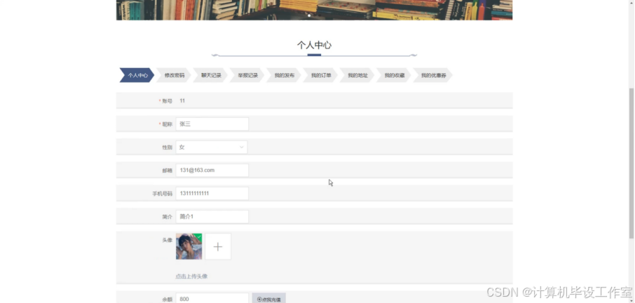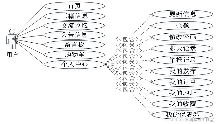 - 用户:可以在交流论坛发布帖子,也可查看论坛的帖子内容,可以对内容进行点赞、收藏和评论,另外,对违规的帖子有权限进行举报;浏览公告信息和书籍信息列表,搜索书籍信息,领取优惠券、咨询卖家,可以收藏商品、也可加入购物车或选择立即购买,系统采用余额支付方式,用户可以在线充值余额进行购买,还有对订单管理,包含查看订单状态、可以确认收货、评价和申请退货等功能。