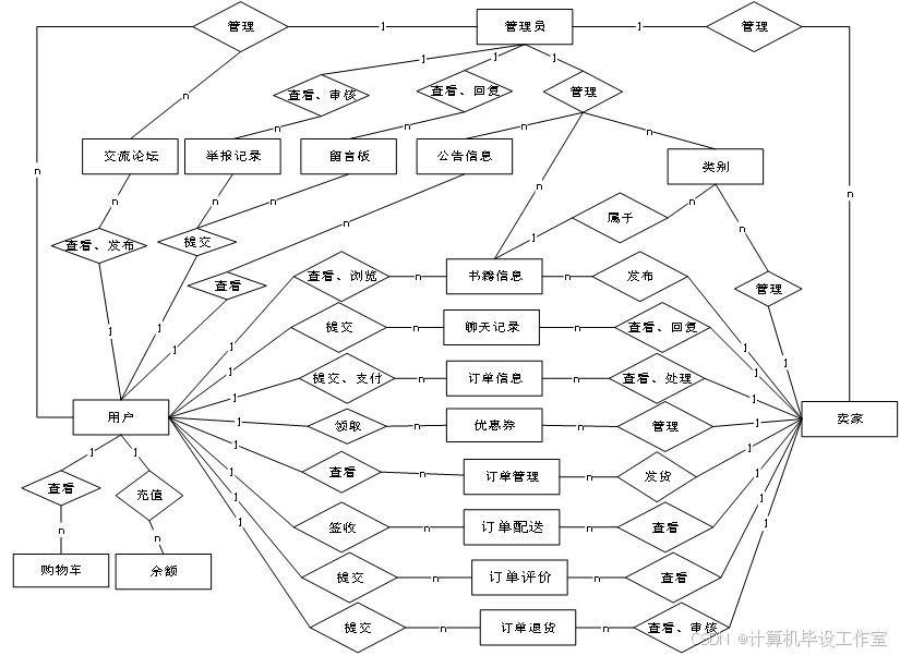 三、功能模块设计:平台功能设计将充分考虑用户的不同需求。系统分为用户、卖家和管理员三大角色。用户可以通过注册功能建立个人账号,登录系统前台,可以访问首页、查看公告信息,浏览交流论坛帖子和举报违规的帖子,也可以发布帖子,与其他用户交流互动,提供留言板模块,并可浏览书籍信息详情、领取优惠券、咨询卖家,同时支持购物车、订单管理、地址管理我的账户管理和收藏及评论管理功能。作为卖家,可通过后台查看有关自己的书籍信息数据和图表,提供公告信息快捷窗口和日期模块,还包含书籍信息、优惠券、订单管理和个人中心等功能。管理员功能包括后台首页展示整个系统的书籍信息数据和图表,提供公告信息快捷窗口和日期模块,还包含对用户、卖家、类别、书籍信息、留言板管理、优惠券、交流论坛、论坛分类、举报记录、系统管理、订单管理以及个人中心的管理功能。