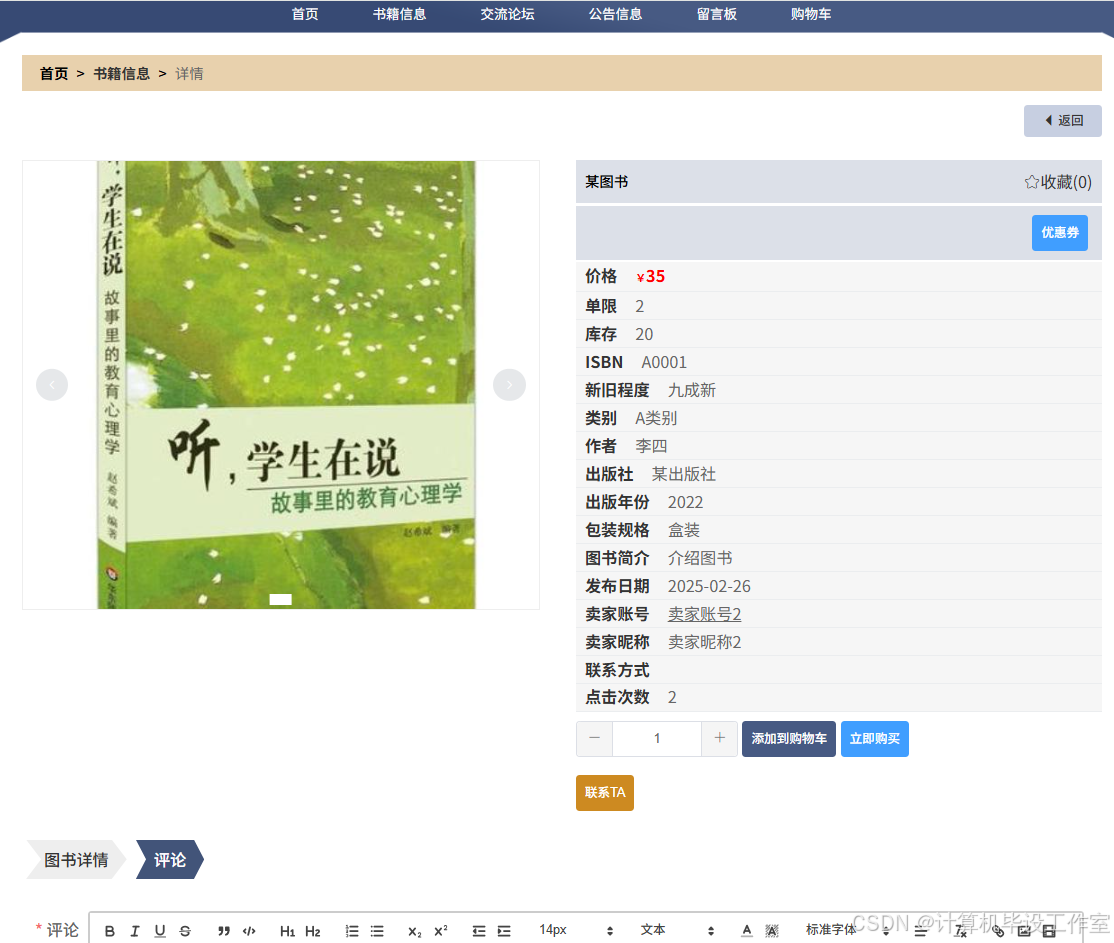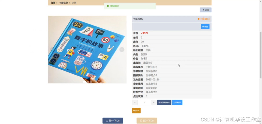 书籍信息模块是系统中主要的模块,主要用于用户在系统上浏览书籍信息。用户可查看发布的所有书籍信息列表,支持书籍名称、新旧程度、类别、点击量、收藏数和点赞数等筛选搜索,查看书籍详情,可以领取优惠券,可进行商品点赞、收藏、加入购物车,也可点击立即购买提交订单信息。另外,可以在页面点击卖家账号进入卖家详情页查看,也可点击联系TA,发送信息进行咨询。交易完成后可进行商品的评价。