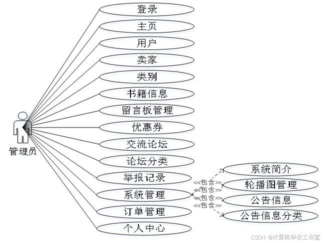 ③ 管理员:具备对用户、卖家、书籍信息、留言板管理、优惠券、交流论坛、论坛分类、举报记录、系统管理、订单管理和个人中心等所有管理功能权限,查看系统书籍信息的数据图表,管理系统配置,更新维护系统等。