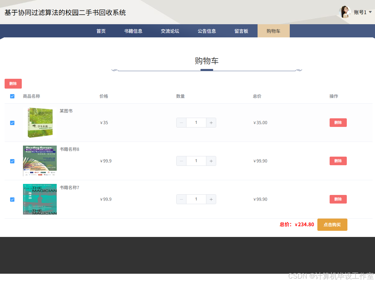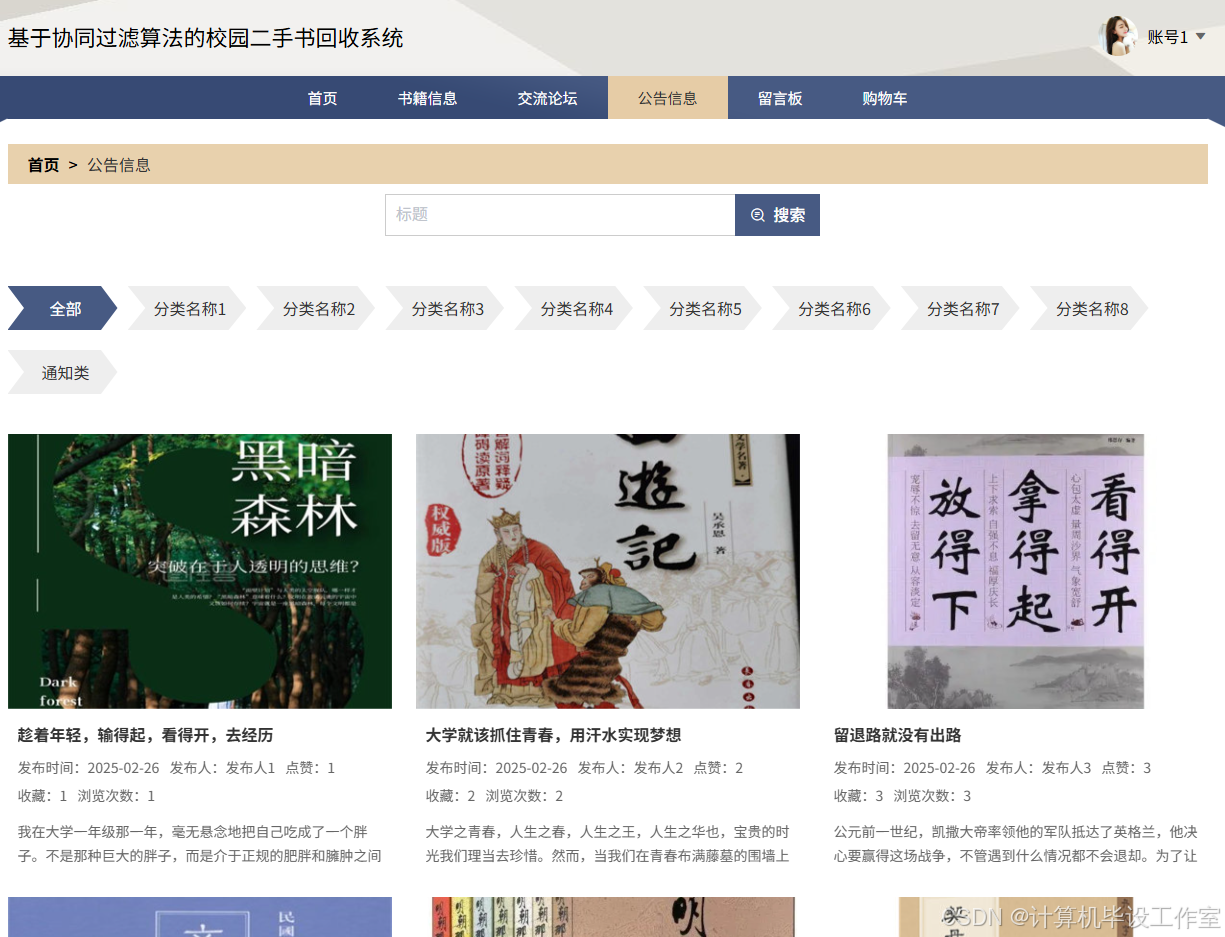 基于协同过滤算法的校园二手书回收系统,不仅可以促进书籍的循环使用,增强学生的环保意识,形成良好的校园二手书市场生态。