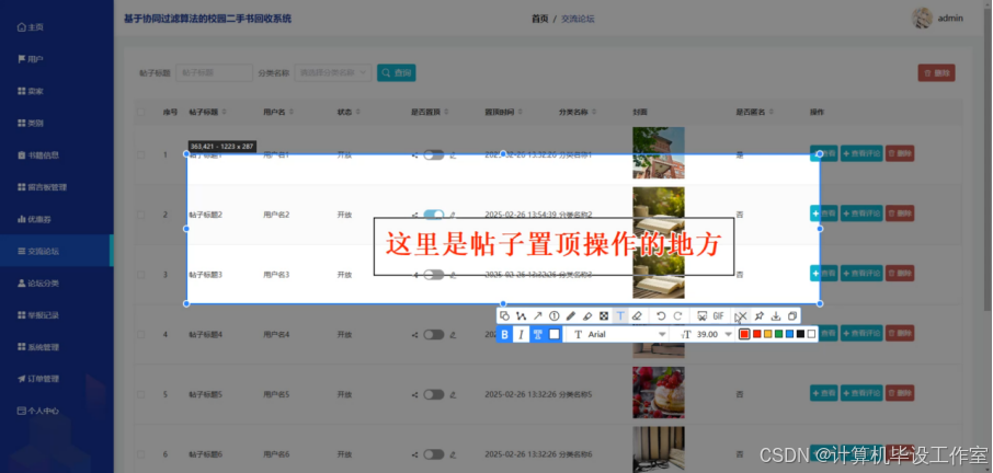 管理员可以在交流论坛查看系统上所有的帖子内容、评论,可以进行删除和置顶操作。