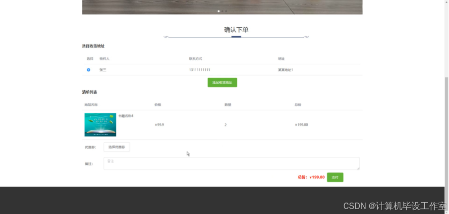 二、系统架构设计:采用Vue.js框架实现用户友好的前端界面设计和交互体验。后端采用了Java作为编程语言,结合Spring Boot框架处理业务逻辑和数据交互。使用MySQL数据库管理和存储平台数据。同时,引入协同过滤算法,基于用户的购买数据,生成个性化的书籍信息推荐。通过推荐系统,用户可以更方便地找到符合其需求的书籍,提升用户购买体验。
