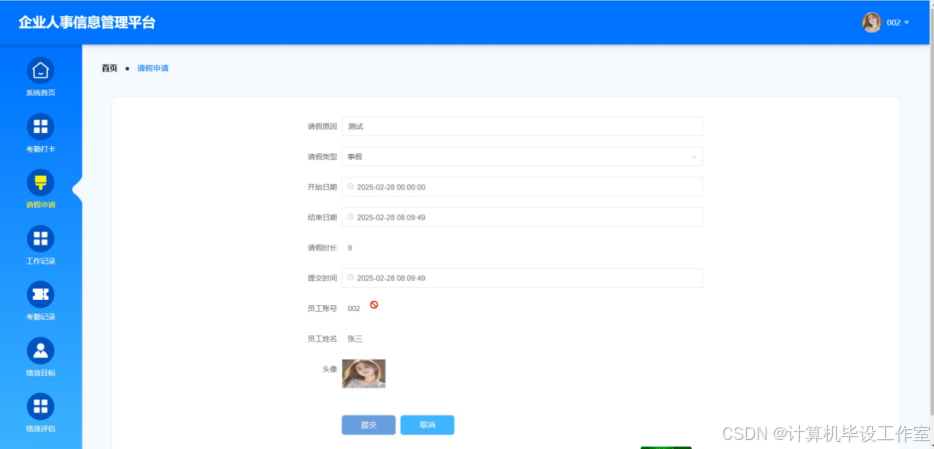 员工可以在请假申请模块,填写请假信息,提交请假申请,由管理员进行审核,员工可随时查看审核状态。管理员则可在请假申请查看员工提交的申请信息,并进行审核处理。