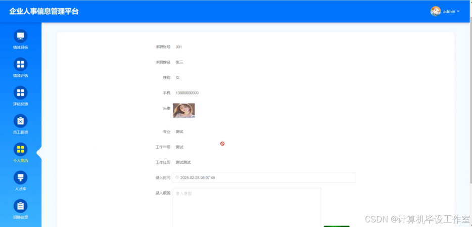 已注册的求职人员可以使用相同凭据登录系统后台,可在后台首页查看通知公告,也可点击个人简历,添加个人简历,可以查看、修改、删除或下载个人简历。管理员则可以查看平台所有的求职人员提交的个人简历信息,可点击人才录入,将求职人员录进人才库。
