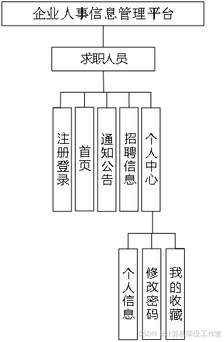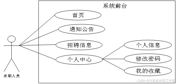 求职人员前台功能需求分析:提供注册登录功能,注册成功后可登录前台,查看通知公告、招聘信息,可以进行投递,可在个人中心查看管理个人信息、修改密码和我的收藏。