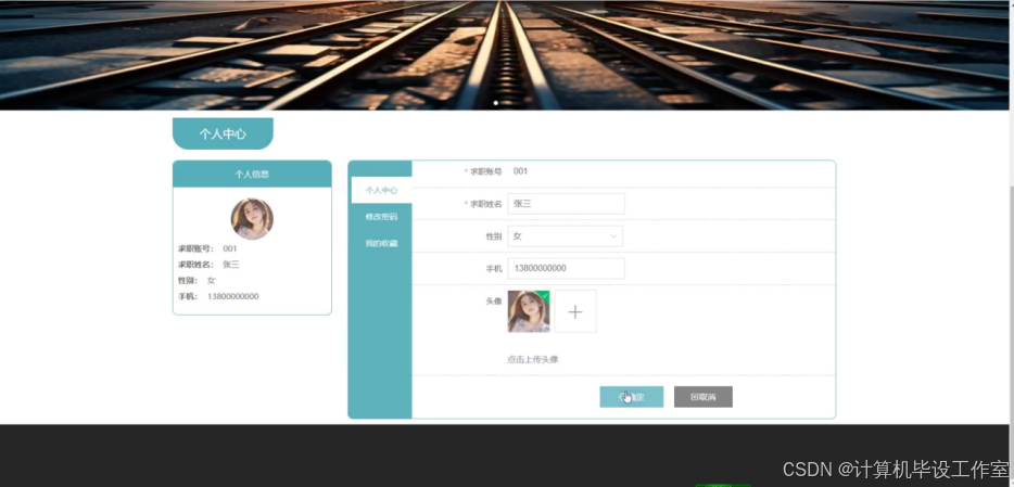 求职人员在个人中心可以对个人信息进行修改更新;可以修改密码;在我的收藏查看、管理收藏内容。
