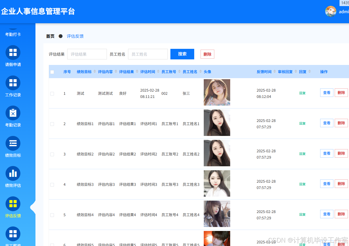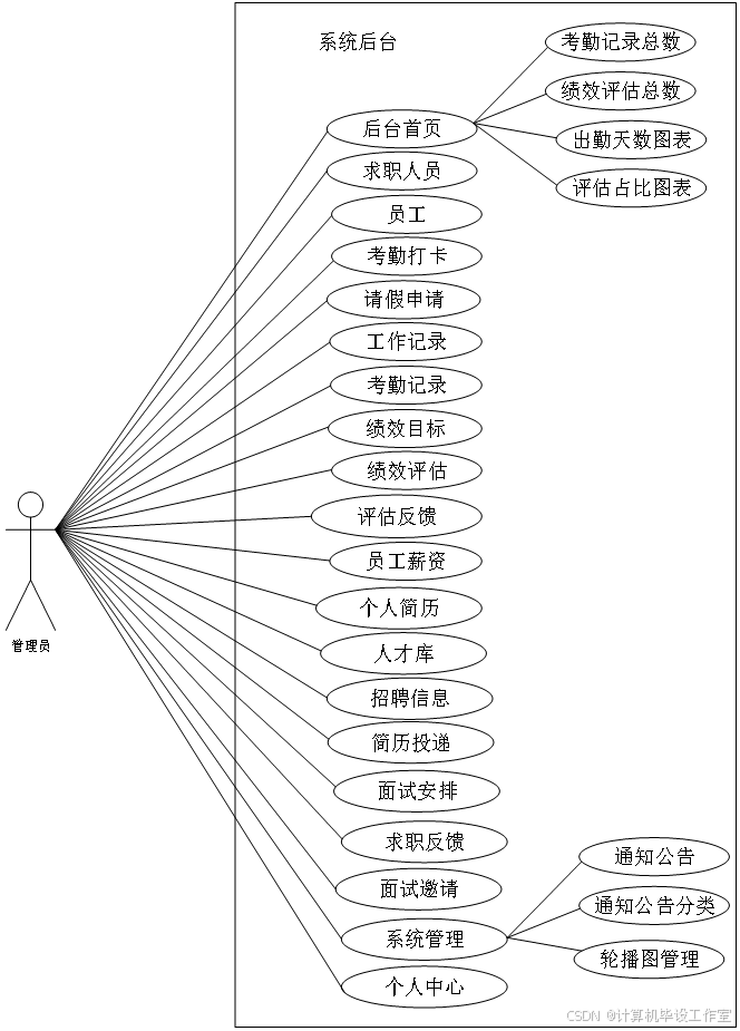 管理员功能需求分析:管理员对平台具有全面的管理权限,在后台首页可查看企业人事信息概览,包含考勤记录总数和绩效评估总数,出勤天数和评估占比图表;对求职人员、员工、考勤打卡、请假申请、工作记录、考勤记录、绩效目标、绩效评估、评估反馈、员工薪资、个人简历、人才库、招聘信息、简历投递、面试安排、求职反馈、面试邀请、系统管理和个人中心的管理。