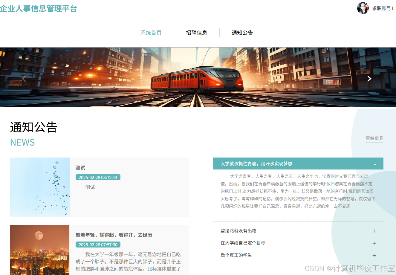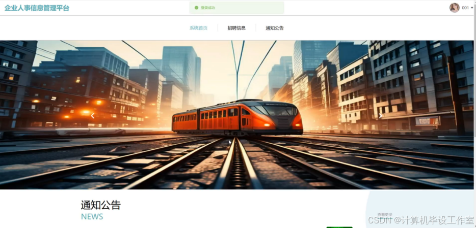 系统首页是平台的主入口,为用户提供导航和重要信息展示。通过清晰的界面布局和内容展示,为用户提供良好的导航菜单、轮播图、通知公告和招聘信息的浏览体验,引导用户进行登录、注册及系统内相关操作。
