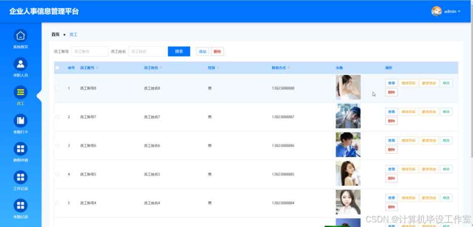 管理员可以查看所有的员工信息,可进行添加、修改和删除;也可点击绩效目标填写内容提交,点击薪资发放,填写相关信息提交。员工则可以在自己的后台查看薪资发放详情。