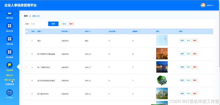 管理员可以在系统管理进行通知公告、通知公告分类和轮播图管理,可以查看、修改、添加和删除内容。