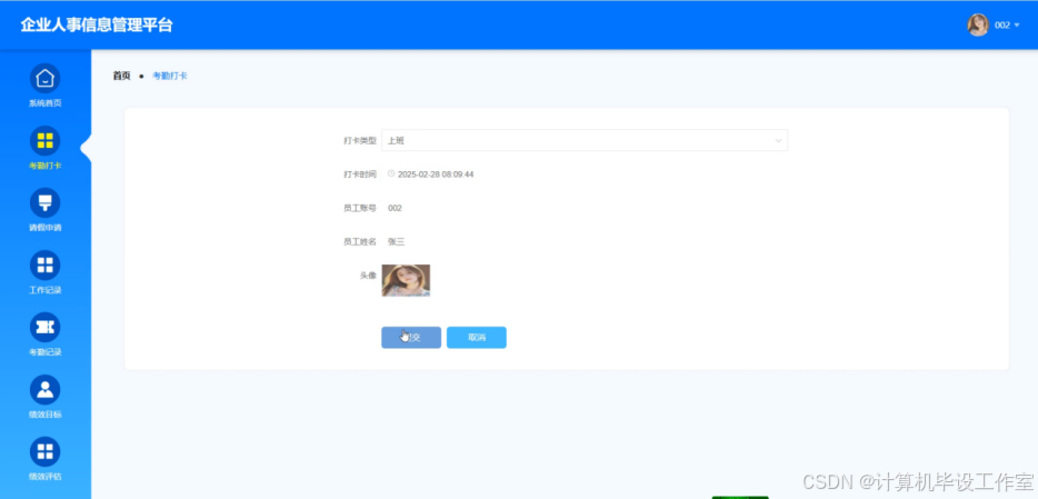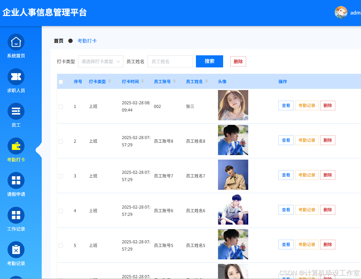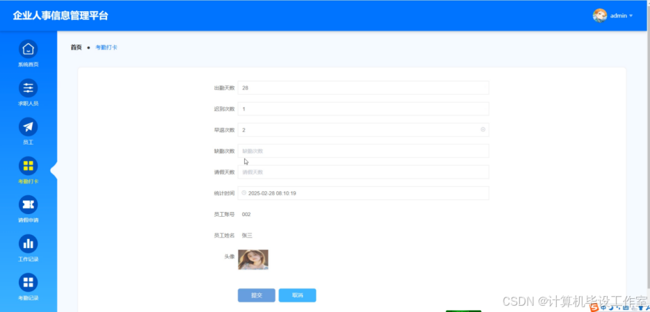 员工注册后可登录系统后台,在考勤打卡中,添加考勤信息进行打卡。管理员则可以查看相关信息,进行考勤记录的添加。