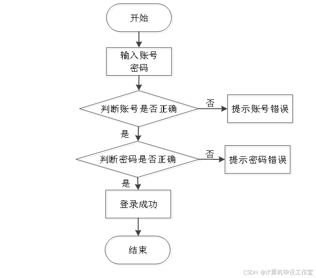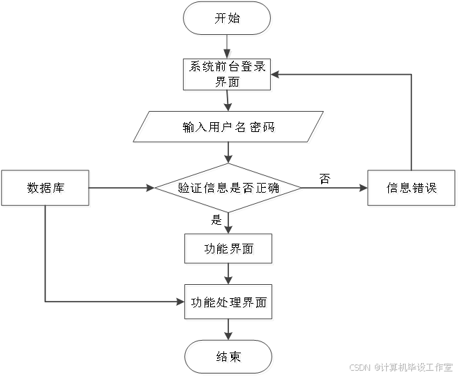 用户访问系统前台,进入登录页面页面,输入用户名和密码,后端服务接收登录请求,验证用户提供的用户名和密码是否匹配数据库中存储的信息,验证通过即可登录成功。登录流程图如下图所示。
