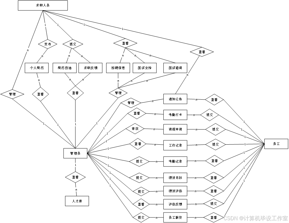 按照企业人事信息管理平台的需求分析,系统划分为了求职人员、员工和管理员这三大角色。